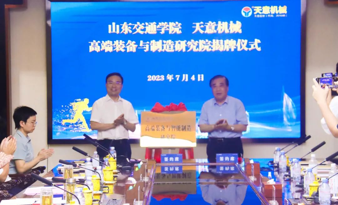 對(duì)接會(huì)上,山東交通學(xué)院黨委書記王煥斌與山東天意機(jī)械股份有限公司董事長(zhǎng)劉洪彬共同為天意機(jī)械—山東交通學(xué)院高端裝備與智能制造研究院揭牌。