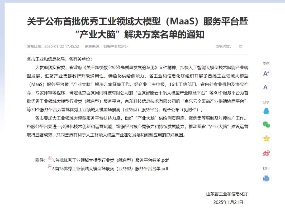 近日,山東省工業(yè)和信息化廳公布了山東省首批工業(yè)領域優(yōu)秀大模型服務平臺名單及數字化轉型促進中心入庫名單,山東天意機械股份有限公司榮幸地名列其中。