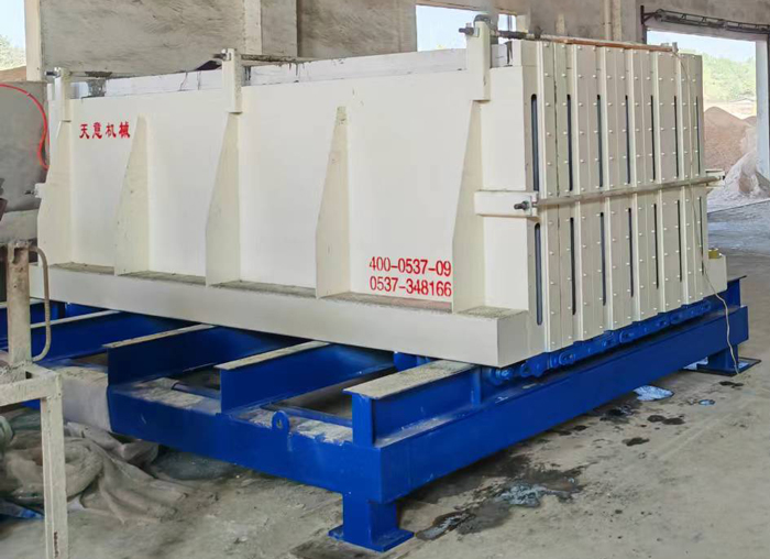 工作原理:模具的開(kāi)合由下方的液壓機(jī)構(gòu)完成,和墻板機(jī)類似。合模后的鎖緊由上方和兩端的拉桿裝置實(shí)現(xiàn)。下方的強(qiáng)制同步裝置保證了大板在開(kāi)合時(shí)的兩側(cè)同步。大板下方的輪組保證了大板在開(kāi)合時(shí)不傾斜、不倒伏。